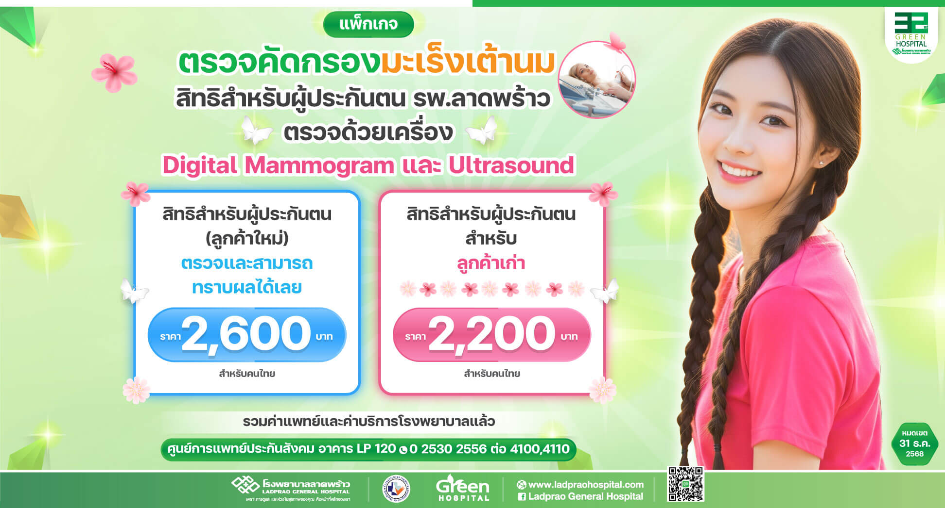 แพ็กเกจ : ตรวจคัดกรองมะเร็งเต้านม ด้วยเครื่อง (Mammogram Digital และ Ultarsound) (สำหรับผู้ประกันตนและครอบครัวผู้ประกันตน)